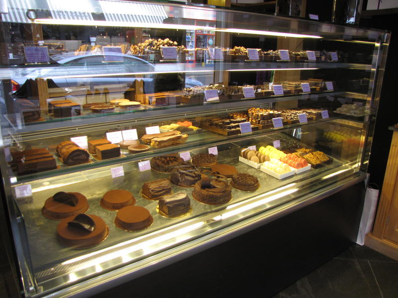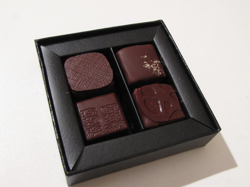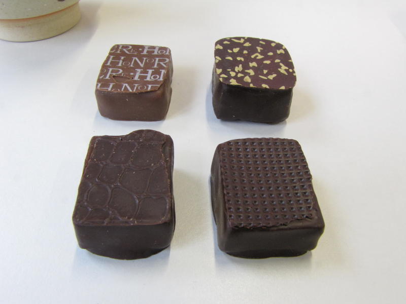 Les bonbons sont gros, trop gros, avec une couverture extrêmement épaisse. sur les quatre que j’ai pris je ne reconnais que celui à la framboise, les autres… impossible de déterminer à quoi ils sont. Si j’y retourne, je me restreindrais aux pâtisseries.