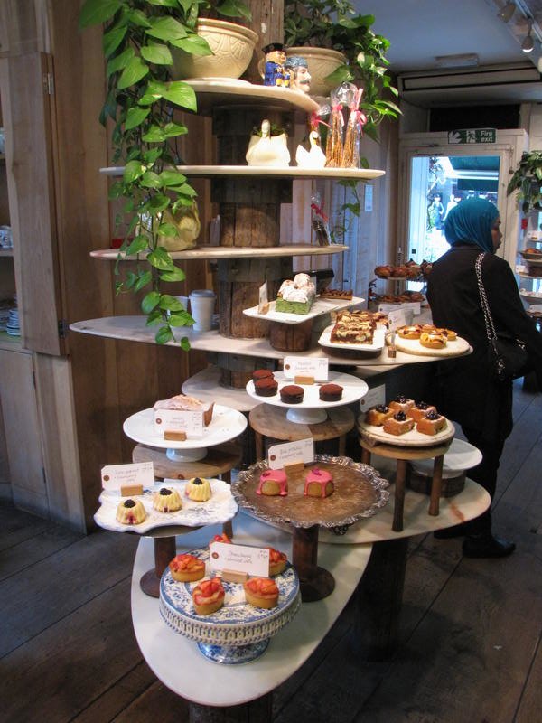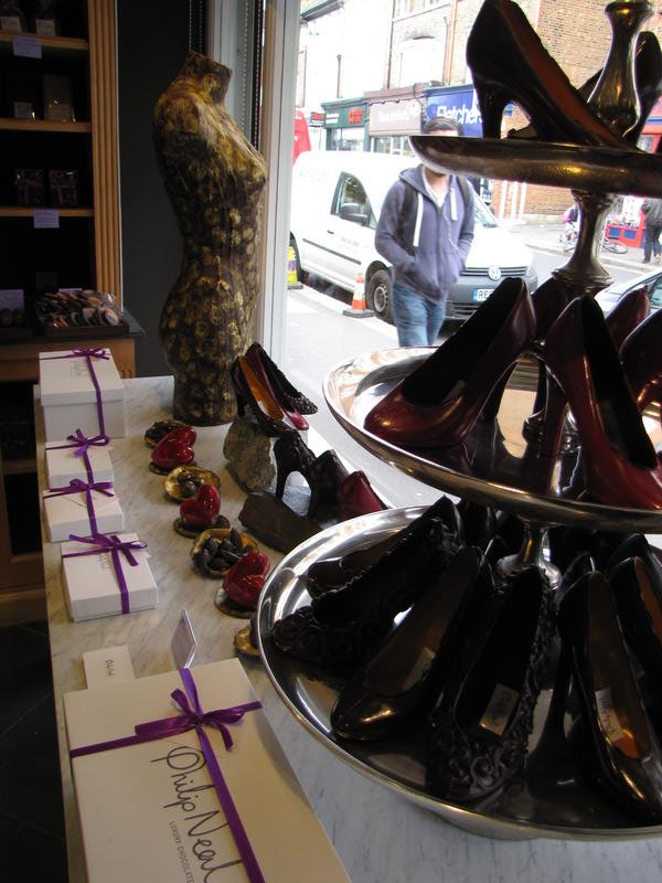 Je quitte Notting Hill pour pousser plus à l’ouest. Par chance j’ai deux boutiques dans la même rue. D’abord Philip Neal : Pour les fan d’escarpins, c’est le paradis, plein de sculptures en vitrine et en vente. Il y a un bon nombre de pâtisseries dont une tarte au chocolat me fait diablement envie. Malheureusement, vu que je vais encore bien vadrouiller cet après midi, elle ne tiendra pas vraiment le coup. Je me laisse donc tenter par quelques bonbons.