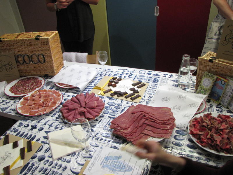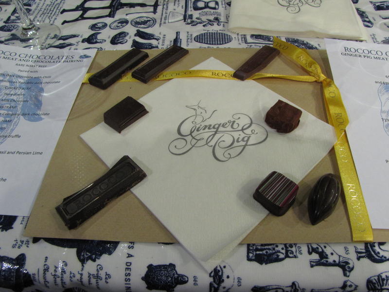 Le soir fut l’occasion de la dégustation chez Rococo Chocolates : Viande et chocolat. Sam Smallman, notre hôte pour cette soirée assez surprenante s’était associé, pour cet évènement, avec Le Ginger Pig, une chaine de boucheries qui organise des stages de préparation de viandes.
