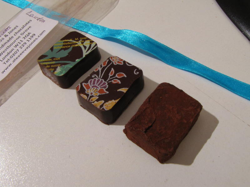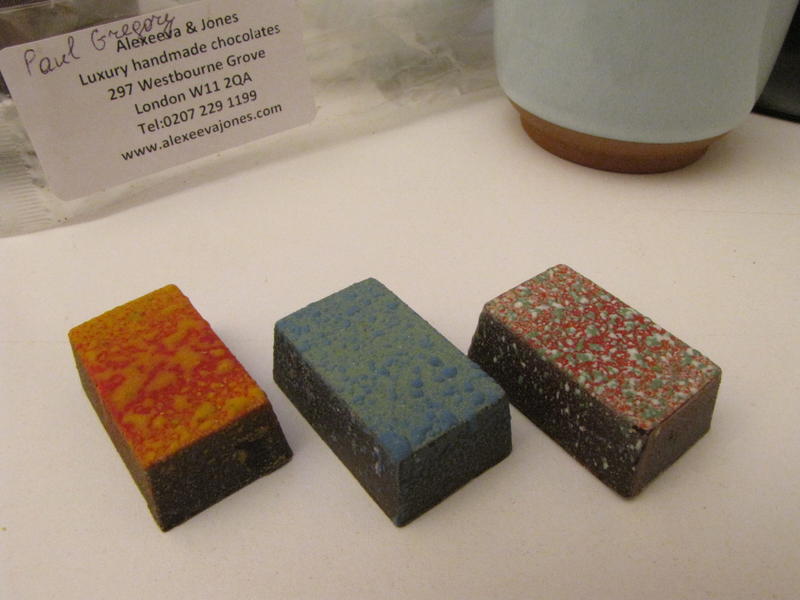 J’y ai aussi gouté des chocolats de Paul Wayne Gregory un chocolatier Londonien qui ne semble pas encore avoir de boutique. Le design des chocolats est très surprenant de part la couleur et l’aspect moucheté. La couverture est très épaisse et on ne peut distinguer les bonbons à l’odeur. J’ai trouvé les ganaches très sucrées et courtes en bouche.