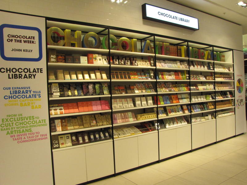 Direction ensuite vers le Selfridges, un grand magasin qui avait retenu mon attention pour leur bibliothèque à chocolat. Il présente effectivement un mur complet de tablettes d’origines diverses et variées. Il y a aussi des corners de différents chocolatiers ici et là.