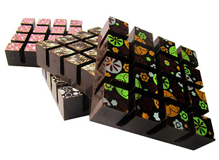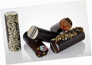 Chacun peut y voit la forme qu’il préfère : tube, tour, cylindre, et pourquoi pas cartouche...des munitions de plaisir à partager... Il crée ses propres moules qu’il garnit de bon chocolat, de ganaches parfumées ou de pralinés.