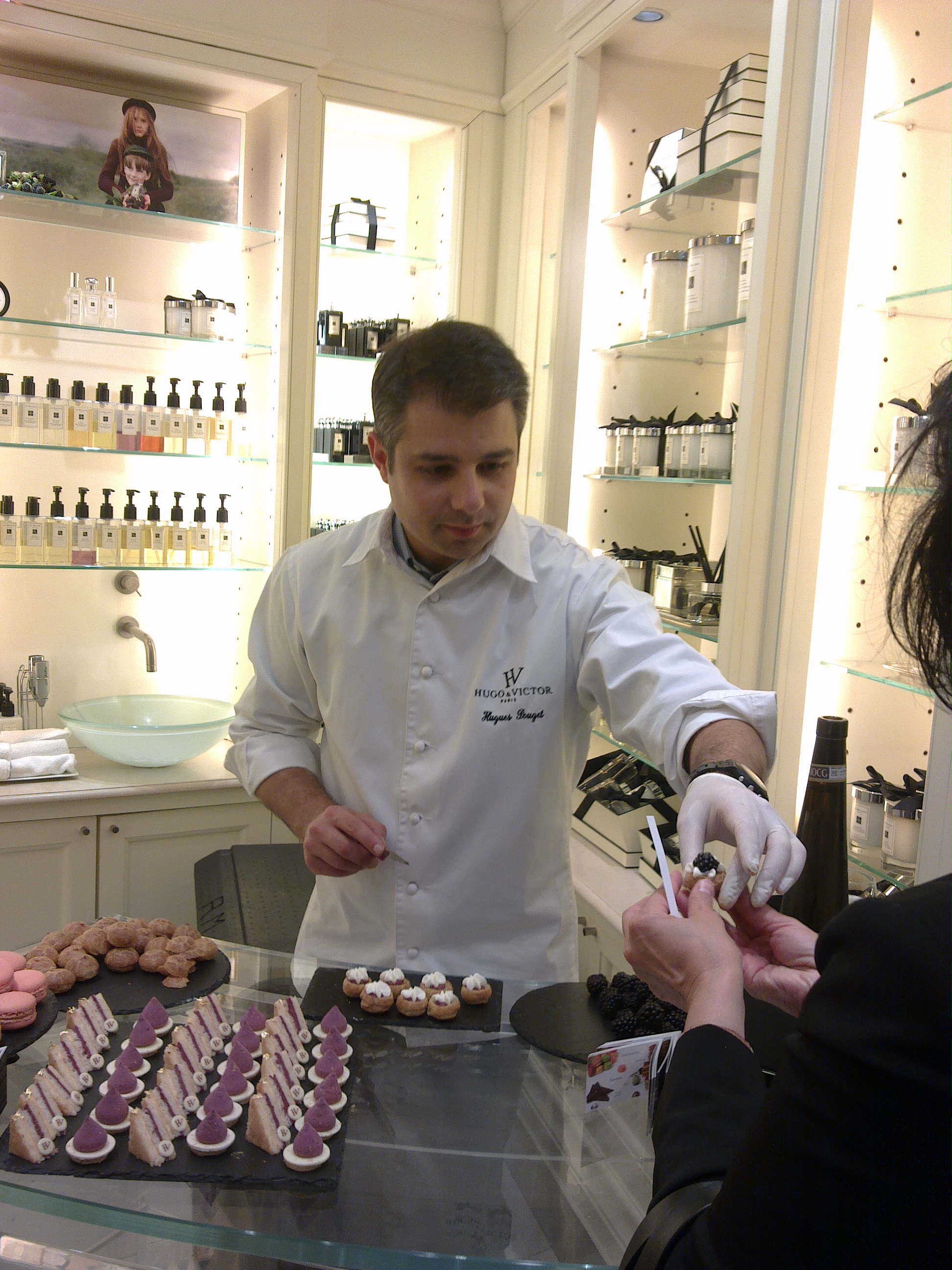 Il dresse sous nos yeux, comme à son habitude, de petits choux avec une crème parfumée surmontés d’un morceau de groseille, accompagnés d’une coupe de Moscato ou de champagne.