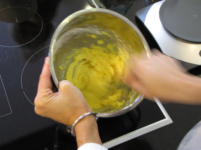 Mettre le beurre en pommade, puis incorporer le sucre glace et les jaunes.