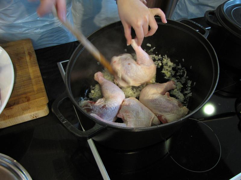 Faire revenir les morceaux de poulet dans l’huile avec les oignons.