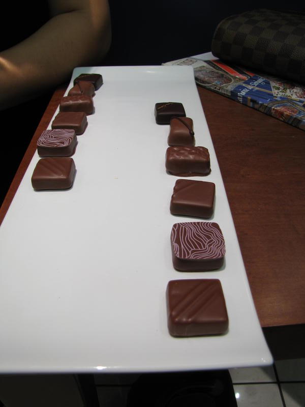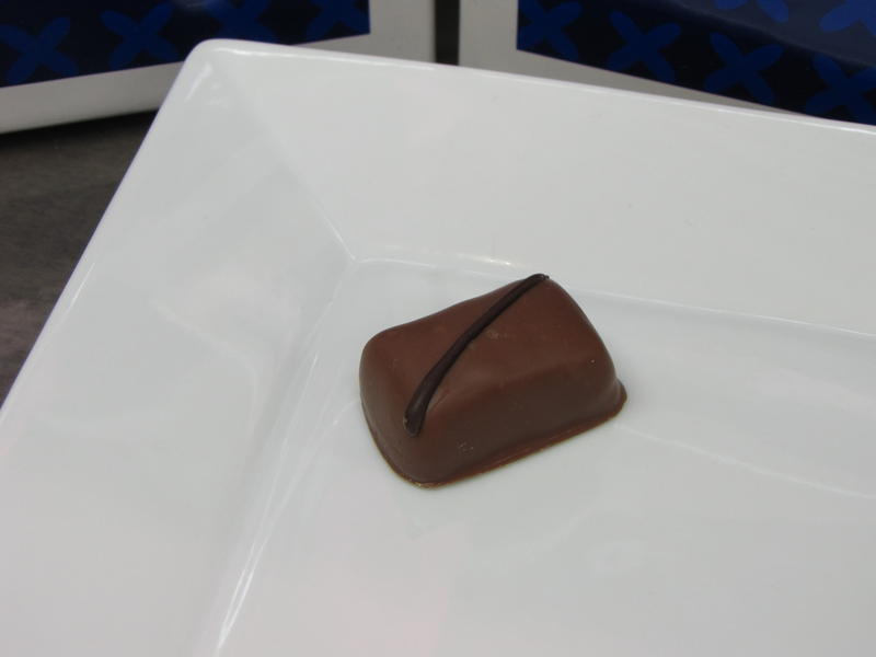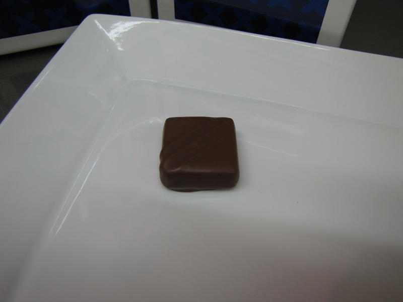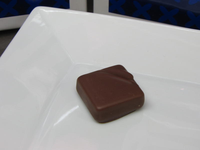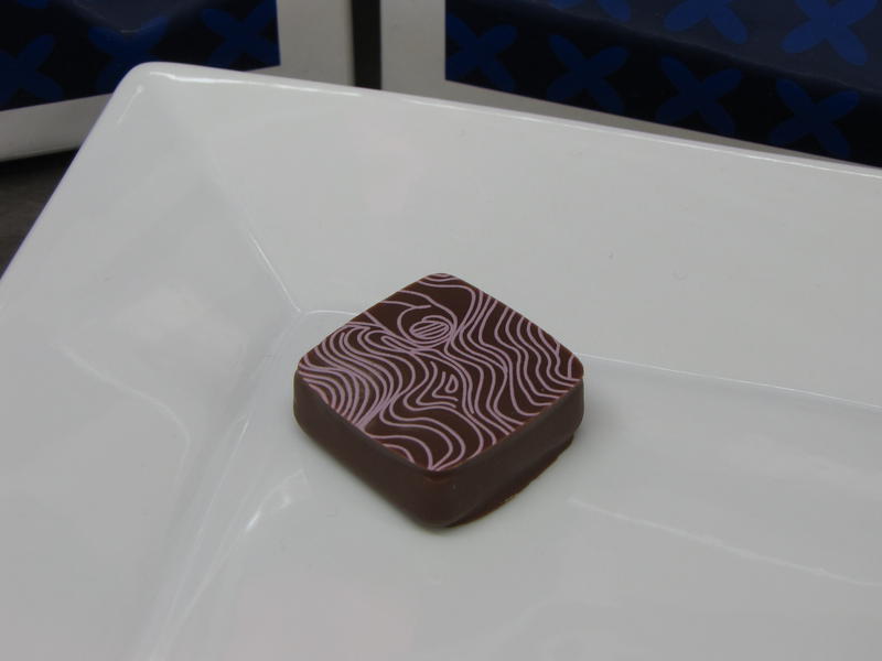 Comme nous le constatons d’emblée à travers les 6 différents bonbons joliment dressés sous nos yeux, la maison souhaite satisfaire la gourmandise de son public en proposant des chocolats de grande taille, les rapprochant en dimension de la tradition belge, puisque nous sommes ici sur des bonbons d’une dizaine de grammes contre généralement 5 à 6g chez les chocolatiers de renom de la place parisienne. On remarque également une régularité parfaite dans cet assortiment, signe que les pralinés ont subi un enrobage « à la coquille » et non pas un découpage « à la guitare ». De la même manière, le procédé « one shot » utilisé pour la confection garantit aux clients un produit identique tant sur le plan visuel que gustatif d’un achat à l’autre. On notera que la maison sucre abondamment ses bonbons ce qui présente l’avantage de pouvoir les conserver beaucoup plus de temps que la moyenne avec des pralinés ayant des Date Limite d’Utilisation Optimale(DLUO) pouvant aller jusqu’à 10 semaines quand on sait que la plupart des ganaches vendues dans le commerce se conservent autour de 3 semaines. Plusieurs membres seront surpris d’apprendre à ce propos qu’une ganache ne congèle pas même à des températures extrêmement basses et que seul l’enrobage, très épais ici dans un souci de conservation, peut subir cette transformation d’un point de vue physico-chimique. Cette récente découverte illustre une fois de plus le fait que l’univers du chocolat est encore un vaste chantier et que la recherche scientifique s’invite aussi sur le terrain de la gourmandise et du plaisir des sens !
