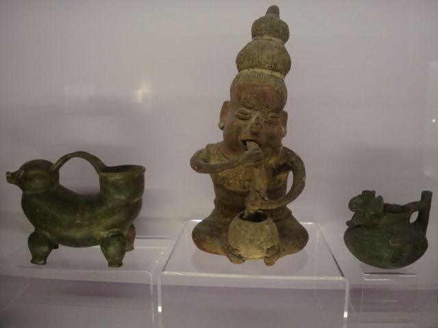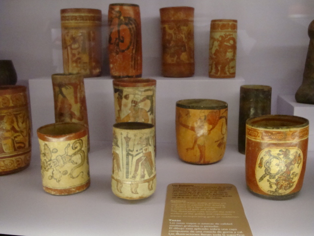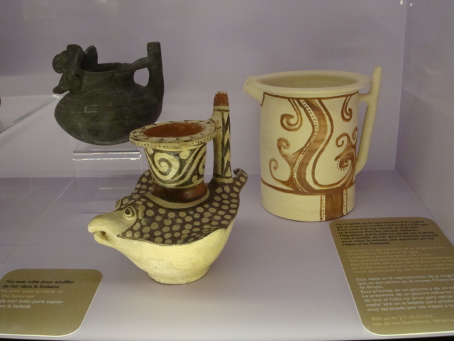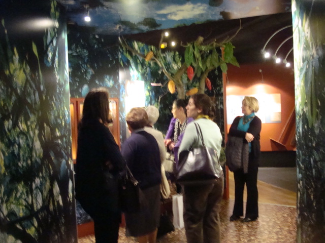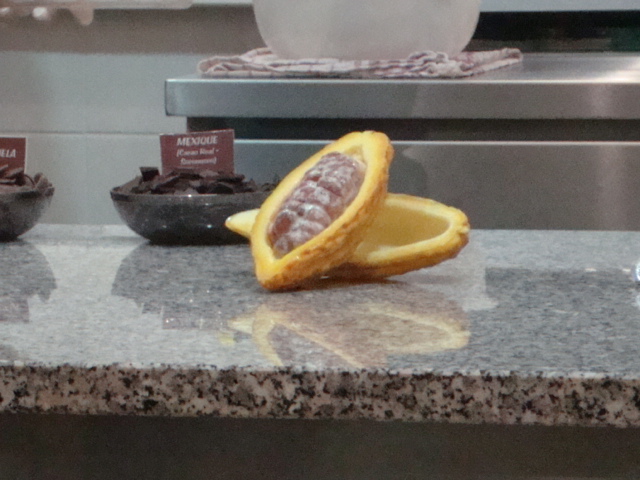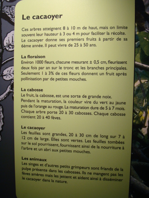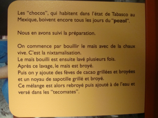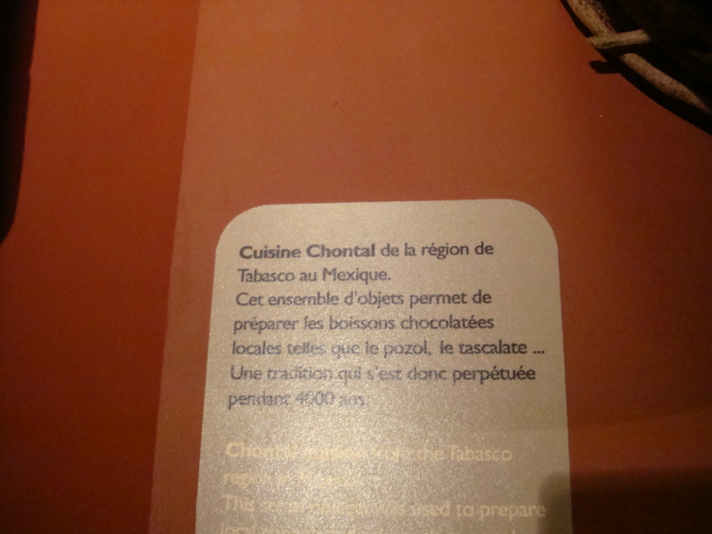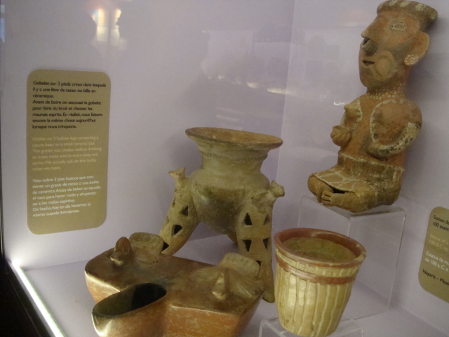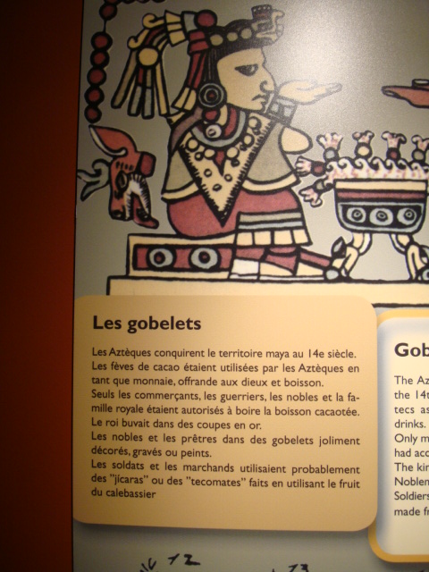 Au rez-de-chaussée, les premiers dioramas nous expliquent la biologie et la génétique du cacaoyer. Même pour les amateurs avertis que nous sommes, c’est l’occasion d’apprendre une quantité de détails comme par exemple le fait que le bananier, souvent associé au cacaoyer par l’ombre qui lui confère, n’est pas un arbre mais bel et bien une plante. Une particularité du cacaoyer réside dans le fait que ses fruits (cabosses) poussent directement sur le tronc et que seulement 1 à 2% des fleurs sont pollénisées et pourront éventuellement donner naissance à ce produit rare et délicat qu’est le cacao. Nous sommes tous impressionnés d’apprendre que trois variétés seulement de cacao sont cultivées (criollo , forastero, trinidad) alors que des dizaines de milliers ont été recensées à l’état sauvage. Notre guide nous rappelle également l’origine divine du cacao apporté aux hommes par le dieu Quetzalcóatl. Traitée comme telle, cette boisson divine était réservée à certaines castes : guerriers, familles royales, prêtres… mais aussi certains commerçants qui l’utilisaient pour ses effets dynamisants et affronter la pénibilité de leur travail. A noter qu’à partir de février 2011, une exposition sur « le chocolat et la santé » d’après les dernières études du Dr Robert nous renseignera sur les vertus de ce produit miracle vieux de plus de 4000ans ! Le musée présente une pièce exceptionnelle datée de -2000ans avant JC. Ce « metate », logo de la maison du chocolat que les gourmands doivent certainement avoir en tête, servait à broyer les fèves une fois torréfiées et ainsi obtenir la fameuse « masse de cacao » ou « pâte de cacao » que l’on utilise encore aujourd’hui. Nous apprenons également que la fève servait de pièce de monnaie de part sa très bonne conservation dans le temps. Quelques conversions nous ont valu des éclats de rire : un lapin coutait 10 fèves, un esclave 100 fèves… je vous laisse imaginer nos différentes estimations quant au prix d’une femme ! Cette première section du musée se termine alors par la présentation de différents gobelets, cruches et moussoirs datant de la période Aztèque et Maya.