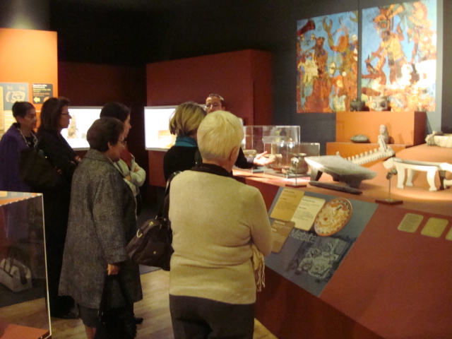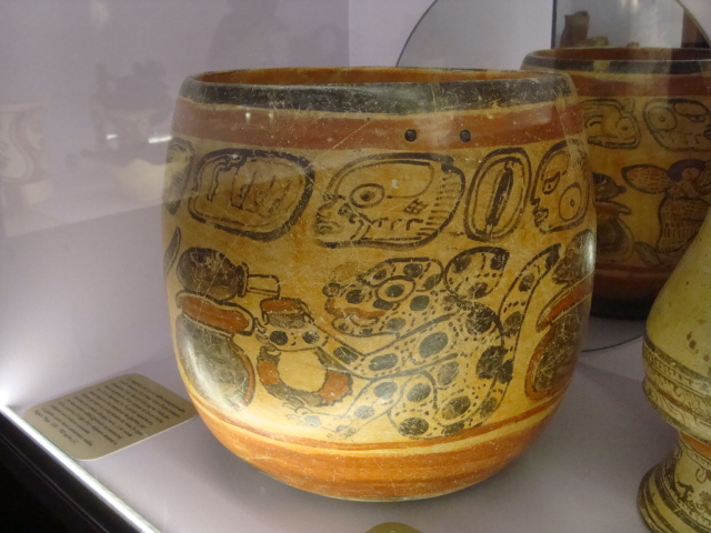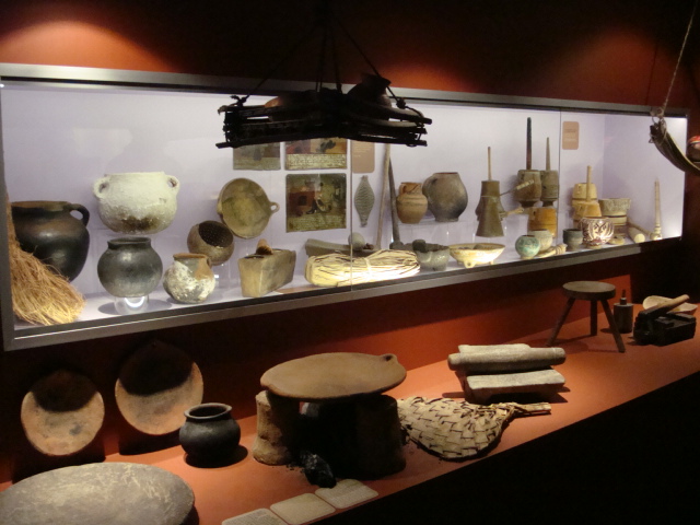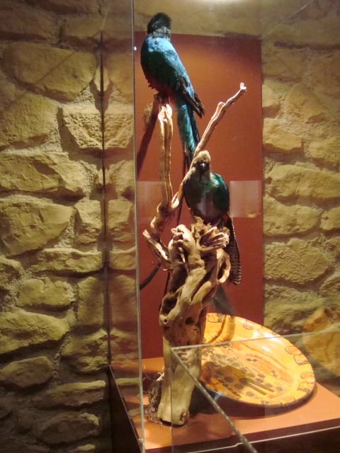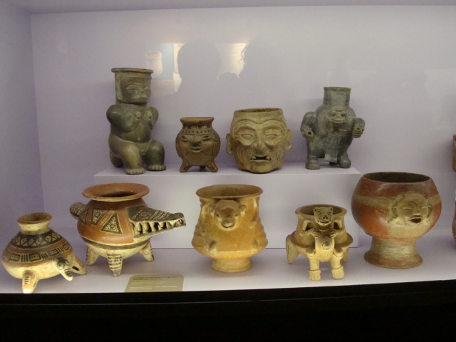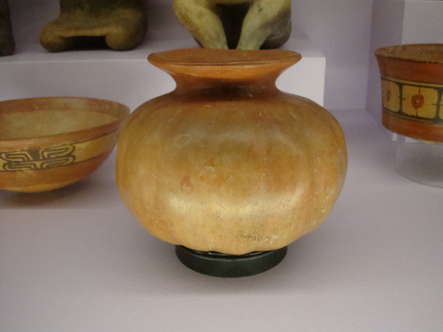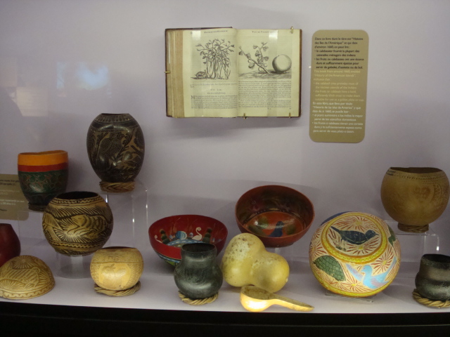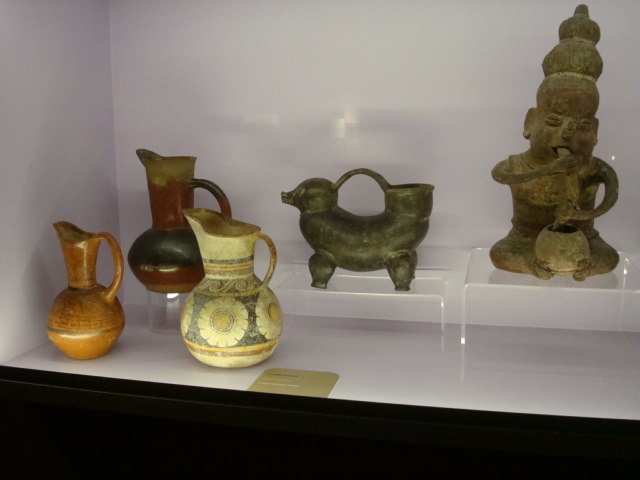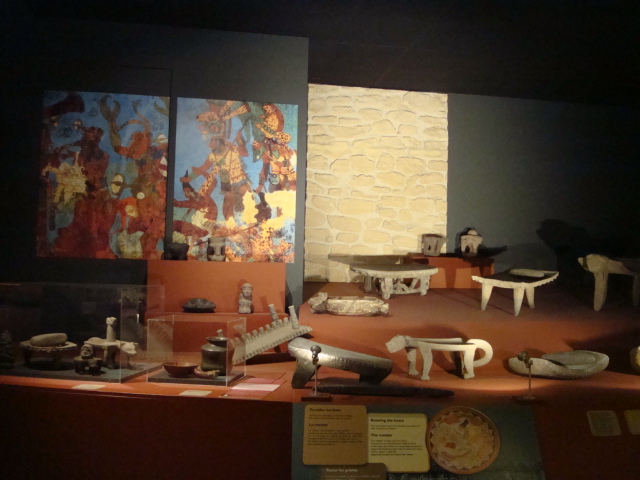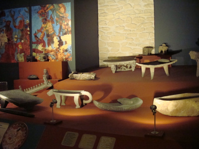 Au rez-de-chaussée, les premiers dioramas nous expliquent la biologie et la génétique du cacaoyer. Même pour les amateurs avertis que nous sommes, c’est l’occasion d’apprendre une quantité de détails comme par exemple le fait que le bananier, souvent associé au cacaoyer par l’ombre qui lui confère, n’est pas un arbre mais bel et bien une plante. Une particularité du cacaoyer réside dans le fait que ses fruits (cabosses) poussent directement sur le tronc et que seulement 1 à 2% des fleurs sont pollénisées et pourront éventuellement donner naissance à ce produit rare et délicat qu’est le cacao. Nous sommes tous impressionnés d’apprendre que trois variétés seulement de cacao sont cultivées (criollo , forastero, trinidad) alors que des dizaines de milliers ont été recensées à l’état sauvage. Notre guide nous rappelle également l’origine divine du cacao apporté aux hommes par le dieu Quetzalcóatl. Traitée comme telle, cette boisson divine était réservée à certaines castes : guerriers, familles royales, prêtres… mais aussi certains commerçants qui l’utilisaient pour ses effets dynamisants et affronter la pénibilité de leur travail. A noter qu’à partir de février 2011, une exposition sur « le chocolat et la santé » d’après les dernières études du Dr Robert nous renseignera sur les vertus de ce produit miracle vieux de plus de 4000ans ! Le musée présente une pièce exceptionnelle datée de -2000ans avant JC. Ce « metate », logo de la maison du chocolat que les gourmands doivent certainement avoir en tête, servait à broyer les fèves une fois torréfiées et ainsi obtenir la fameuse « masse de cacao » ou « pâte de cacao » que l’on utilise encore aujourd’hui. Nous apprenons également que la fève servait de pièce de monnaie de part sa très bonne conservation dans le temps. Quelques conversions nous ont valu des éclats de rire : un lapin coutait 10 fèves, un esclave 100 fèves… je vous laisse imaginer nos différentes estimations quant au prix d’une femme ! Cette première section du musée se termine alors par la présentation de différents gobelets, cruches et moussoirs datant de la période Aztèque et Maya.