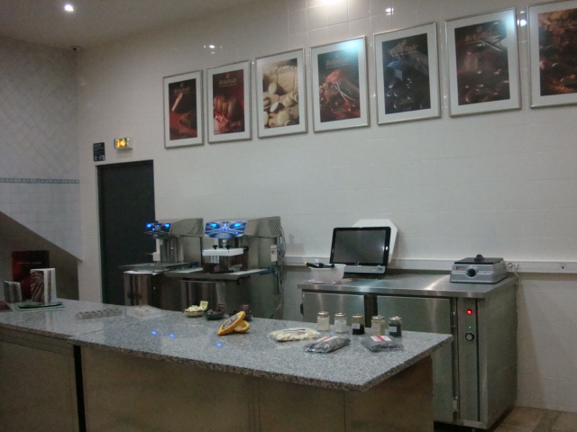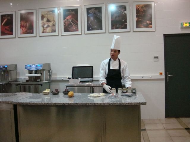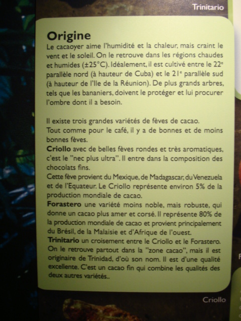 Nous nous dirigeons ensuite au sous-sol où une magnifique exposition de photos nous accueille. Intitulée « Ka’Kawa », celle-ci nous emmène sur les traces du cacao originel : le « Réal ». Enfin dans le laboratoire du musée, nous sommes conviés à une démonstration sur la confection de bonbons fourrés. Nous prenons bien évidemment le temps de les goûter ainsi que les pistoles de chocolat de couverture les composant. Nous testons de ce fait les produits d’un couverturier belge nommé « Belcolade » qui devons nous l’avouer nous a déçu aussi bien par sa pure origine lait Venezuela à 43% que noire Mexique à 70%. Le praliné lait à la couverture épaisse et à la texture extrêmement grasse n’a pas laissé une impression plus favorable.