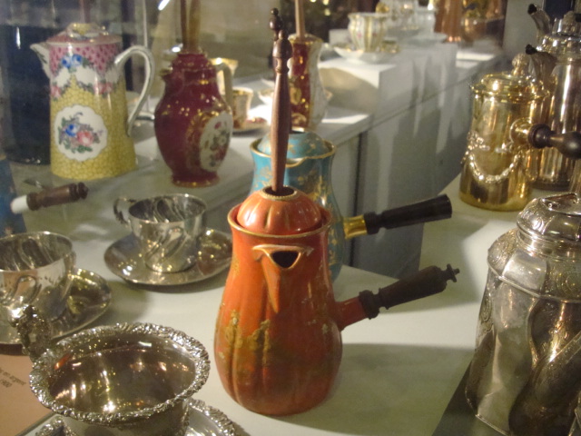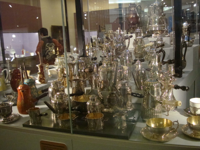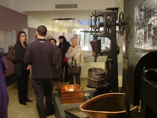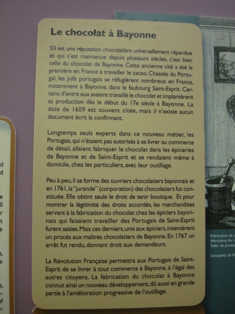 Au 1er étage, nous apprenons que le chocolat n’est devenu une boisson sucrée qu’à partir du 16e siècle. Il n’y a donc qu’à peine 500ans que nous déclinons la traditionnelle recette espagnole de cette boisson restée épicée mais non sucrée jusqu’à la conquête ibérique. Place alors à une question que tout aficionado s’est un jour posée. Le cacao, boisson ou aliment ? C’est la religion qui tranchera en classant ce produit dans la catégorie liquide et donc en l’autorisant pendant le Carême. Après d’autres informations historiques comme par exemple l’arrivée du chocolat en France à Bayonne par les juifs portugais chassés de leur pays, nous retraçons le parcours du cacao depuis la fève jusqu’au beurre, poudre et autre pâte de cacao. C’est l’occasion de taquiner notre guide en le lançant sur la polémique quant à savoir si le chocolat blanc est bien du chocolat ! Nos avis divergent quelque peu … mais ces échanges argumentés et conviviaux ont le mérite de rappeler à beaucoup que le pourcentage de cacao affiché sur une tablette s’obtient en additionnant le pourcentage de cacao issu de la masse de cacao à celui issu du beurre de cacao mais que nous n’avons jamais l’information concernant les proportions pourtant déterminantes dans la qualité du produit fini. Puis c’est un rappel historique sur l’évolution des techniques de travail du chocolat avec quelques dates marquantes comme l’invention de la 1re tablette en 1847 par Fry, le 1er chocolat au lait par le suisse Daniel Peter en 1875 ou le procédé de conchage mis au point par Lindt en 1879. Notons également que cette section du musée abrite une collection de chocolatières tout à fait remarquables.