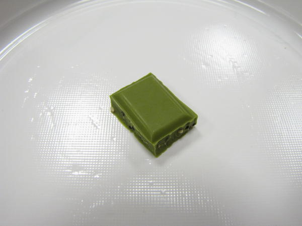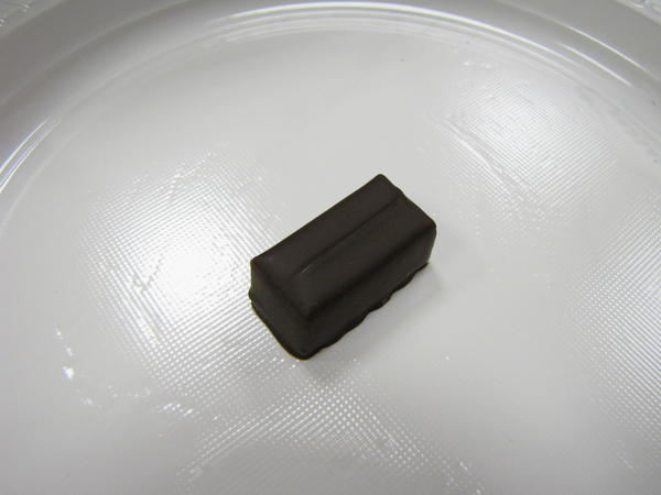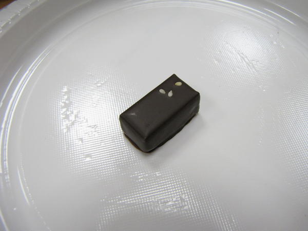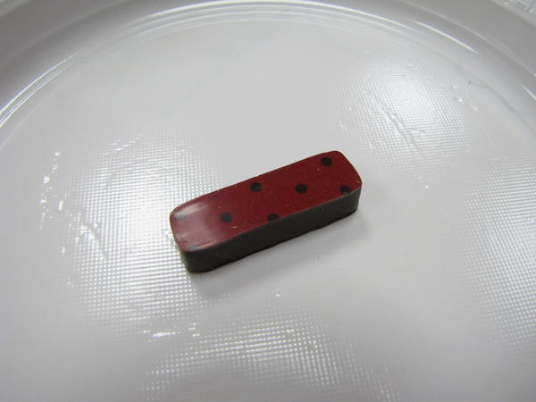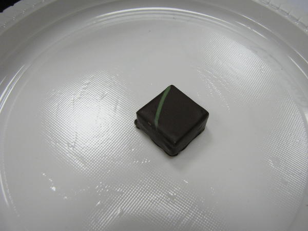 La ganache au thé vert matcha 「抹茶」 appelé Tōkyō 「東京」 qui suit s’avère particulièrement réussie et ce grâce à l’utilisation judicieuse d’un enrobage « blent » de Côte d’Ivoire. Contrairement aux autres chocolatiers qui ont l’habitude de travailler le matcha sur un chocolat blanc, celui-ci est préparé sur une ganache noire. Il en résulte un parfait équilibre entre la neutralité de cette couverture de chocolat d’assemblage et l’amertume du thé. Nous apprécions ensuite un trait caractéristique de cette maison qui sucre au minimum ses productions. En effet, c’est le goût cacaoté, le fruit ou bien l’épice qu’on choisit de mettre en avant et non le sucre. Inconvénient de cette recherche de qualité : une date limite de consommation plus réduite pour l’ensemble des bonbons proposés !
