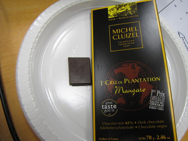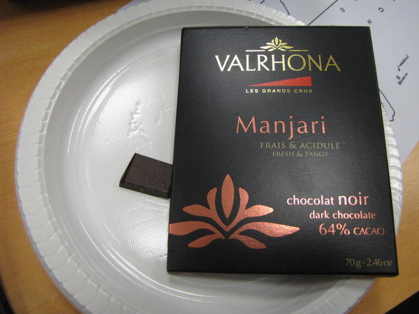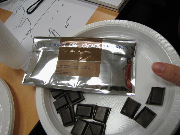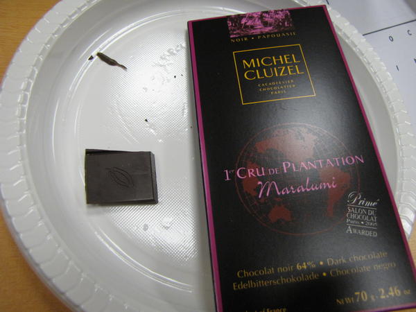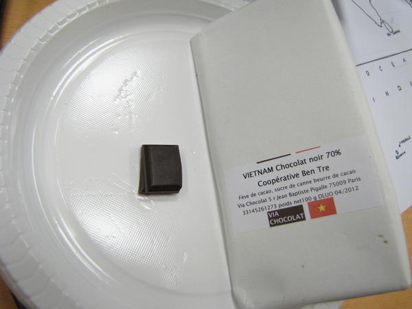 Tout d’abord, nous nous étonnons de la différence d’arôme entre le Ceylan très fumé, au nez de cigare et très long en bouche de Bonnat en comparaison du carré nettement plus fin de JP Hévin. Ce dernier, alliance d’un Forastero du Ghana et d’un Criollo de Java, pourtant de la même teneur en cacao (75%) que le précédent, nous a beaucoup plus séduits de par la finesse de sa texture et son amertume dosée idéalement. Nous trouvons ensuite une note « pain d’épice » dans le Vietnam 70% d’une coopérative locale nommée Ben Tré. Si ce goût singulier s’explique par l’emploi de sucre de canne non raffiné, sa texture n’en pâtît absolument pas. C’est ensuite l’occasion de comparer deux crus de Madagascar. Michel Cluizel avec son Mangaro a su mettre en avant le côté fruité de ce 1er cru de plantation 65% typique du centre de l’île tandis que le célèbre Manjari de Valrhona à 64% laisse entrevoir des notes acidulées de fruit rouge. On y trouve aussi du fruit sec ce qui fait de ce chocolat du nord de Madagascar un Trinitario particulièrement atypique. Place désormais à la Papouasie avec un 64% toujours de la gamme Cluizel et un 70% de Noël Jovy. Nous retrouvons dans ce dernier le côté empyreumatique du premier carré dégusté ce soir avec un parfum de thé fumé très marqué. Nous avons alors la chance d’expérimenter une poudre de cacao biologique « made in Bali » dénichée par Sylviane et Michel Dupin : étonnante par les saveurs épicées qu’elle renferme avec de la cannelle et de la noix de muscade très franches.