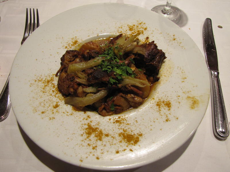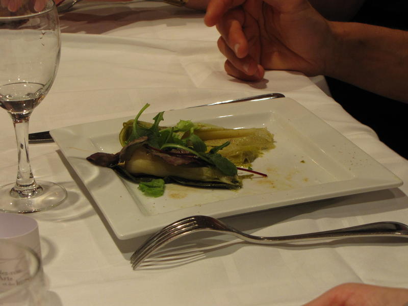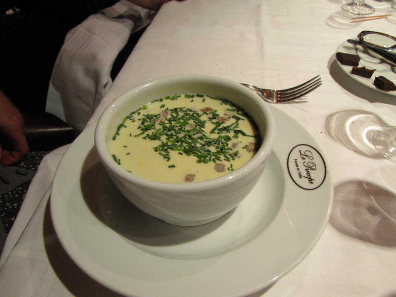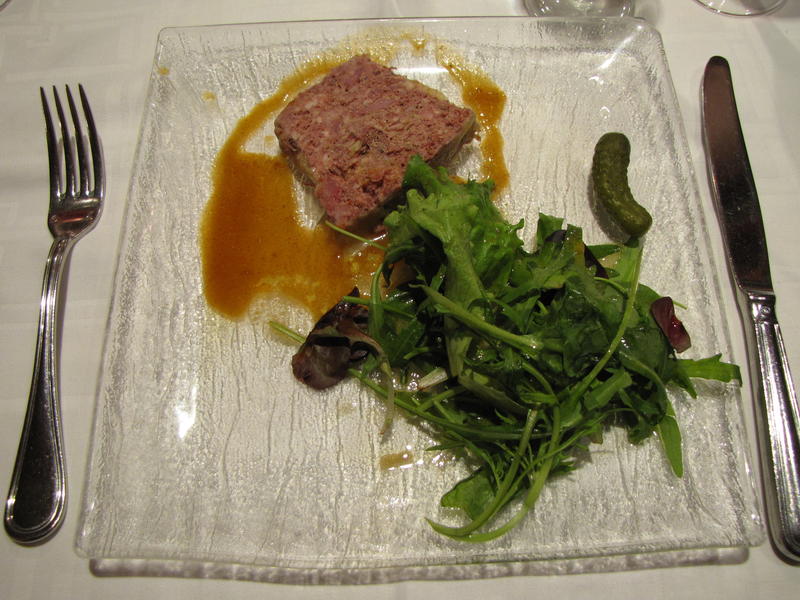 Après un kir au vin blanc pétillant offert par le Procope, les participants commencent le repas autour d’entrées variées : terrine de canard au Riesling, poireaux à l’huile de noix ainsi que velouté aux petits pois. Nous choisissons ensuite entre boudin noir « poire et échalotes confites », fricassée d’agneau curcuma fenouil et aiglefin aux petits légumes.