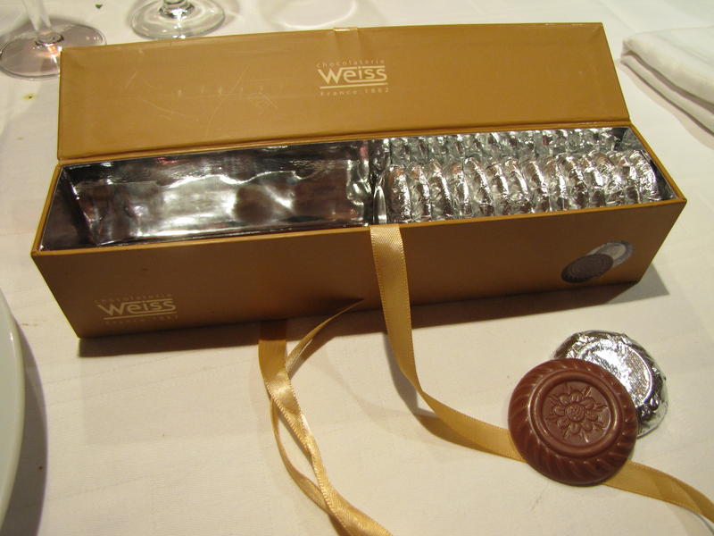 Notre présidente qui a préparé la soirée avec toujours autant de soin nous ravit de deux petites douceurs pour achever le repas. Ainsi les palets Sambacao de la maison Weiss et les grains de café enrobés de chocolat noir de Cluizel permettent aux participants de cette belle soirée de se quitter sur une note sucrée chocolatée et l’envie de se retrouver dès la fin du mois pour de nouvelles expériences gustatives.