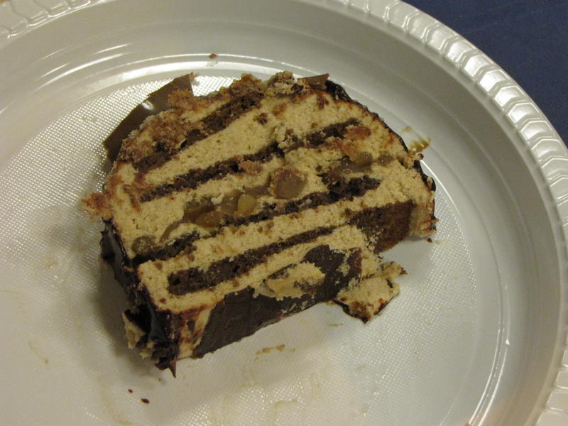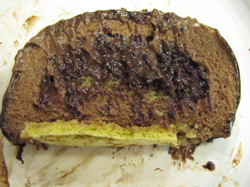 Du biscuit marron-chocolat parfumé au rhum dans une mousse crémeuse de marron parsemée de brisures de marron, le tout sous un glaçage miroir au chocolat