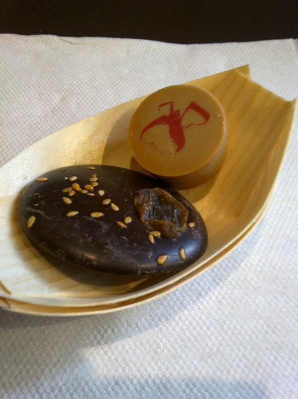 Sur une coupelle en bambou, nous découvrons en « apéritif »deux bonbons
