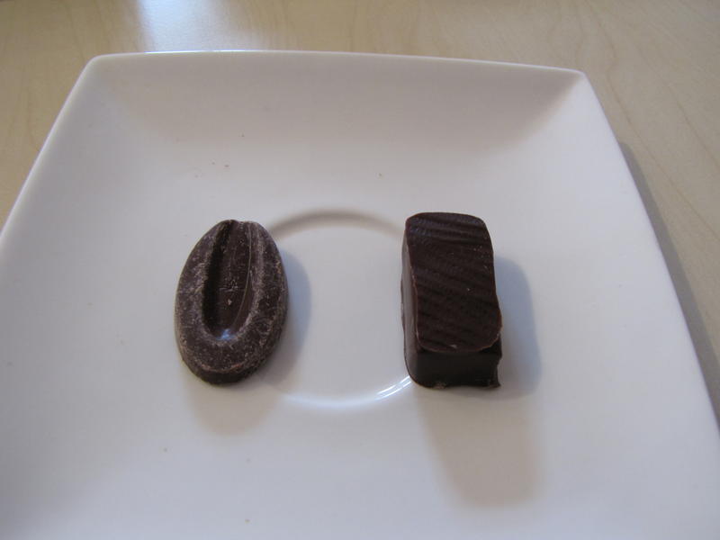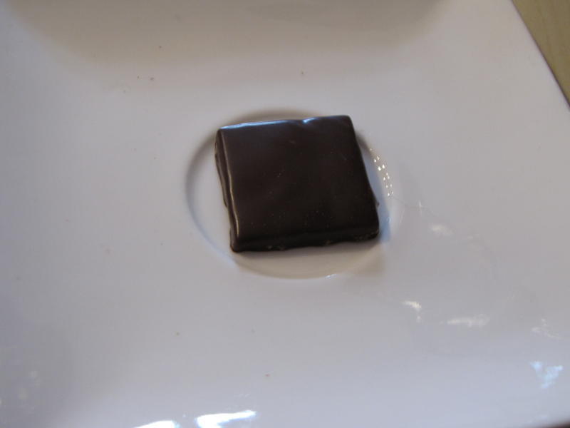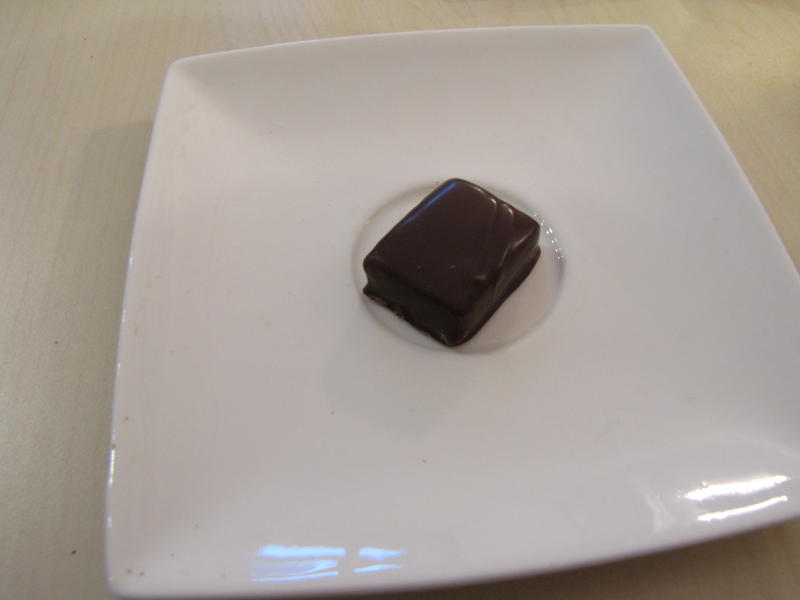 Nous sommes ensuite passés à la gamme de Gilles Cresno, et Michel nous a fait remarquer que les bonbons avaient été fait le 11/4. Comme pour C. Vautier, nous avons pu comparer la couverture brute, un Manjari de Valrhona sous sa forme de pistol, avec la ganache nature confectionnée avec cette couverture. Cette dernière est plus acidulée.