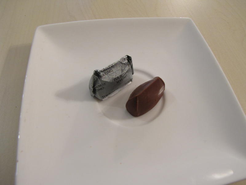 Nous découvrons aussi une pâte de noisettes qui est enfermée dans un papier car ce bonbon n’a pas d’enrobage. Il est carré, d’où le nom en italien « cremino » , en fin de bouche il reste un goût de sel et d’huile d’olives.