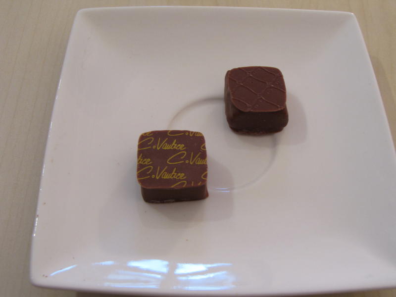 La dégustation a débuté par du chocolat de couverture Domori qui enrobe les chocolats de la gamme de C. Vautier. Immédiatement suivi d’une ganache nature Arriba. Nous avons ensuite remarqué que les bonbons au visuel font 8-10g La ganache nature est un peu grasse, nous avons dégusté un chocolat d’origine Colombie, puis Vénézuela, et Madagascar. Les ganaches sont un peu compactes et pâteuses. Notre préférence s’est portée sur le Madagascar.