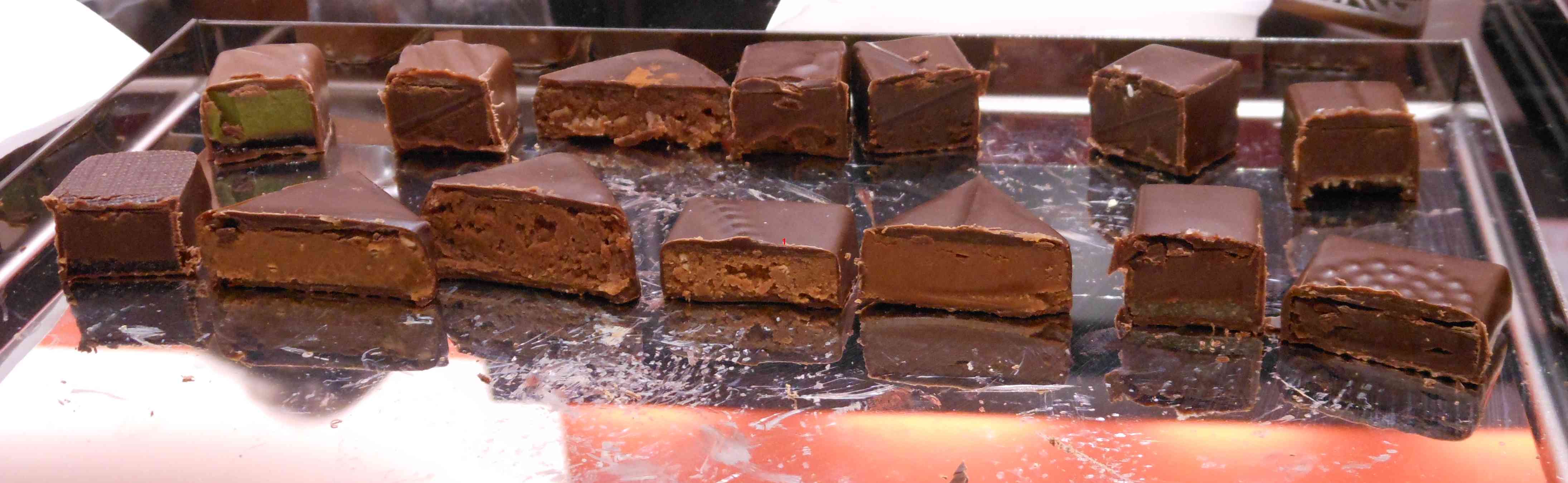 Sur environ 80 chocolats de sa création, nous en avons découvert 14 lors de notre dégustation (Chocolats à 78 euros/kg en ballotins) :