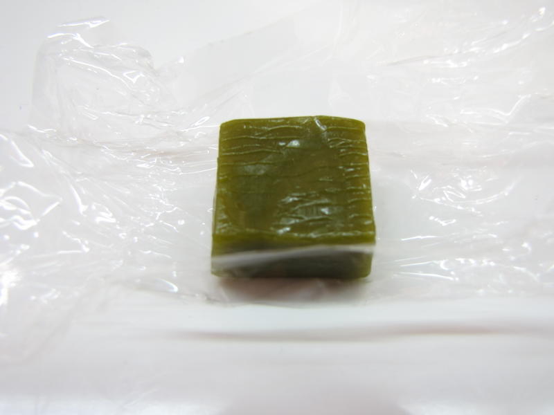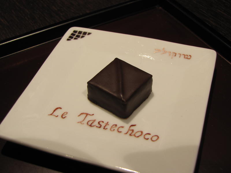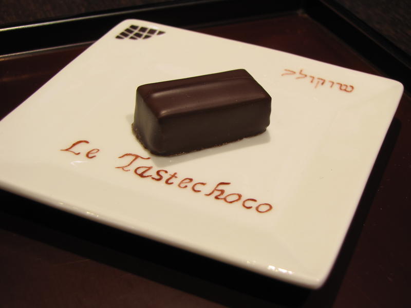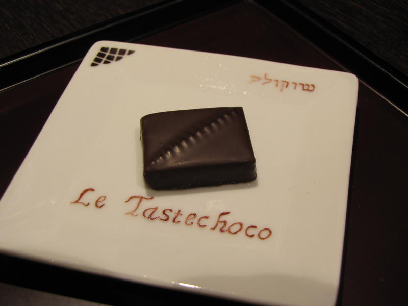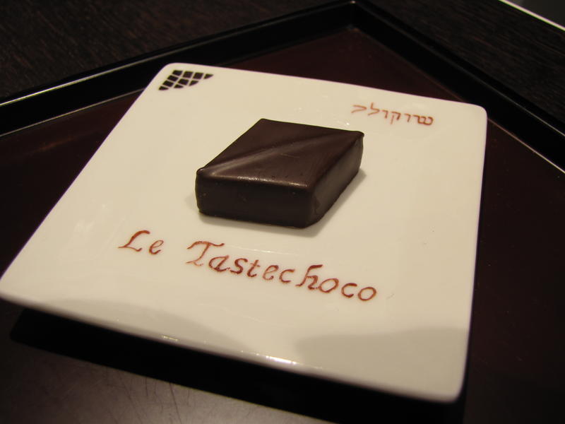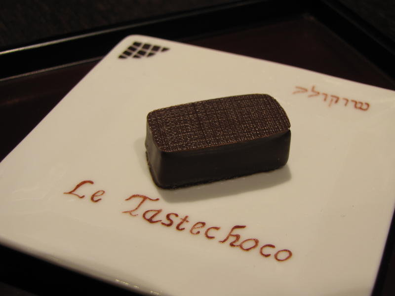 - Chocolat 7 : « Misuko » Une ganache à l’infusion de thé vert légèrement torréfié, le hōjicha. Sur un lit de massepain au hōjiicha. La saveur légèrement fumé du thé hōjicha ressort bien.