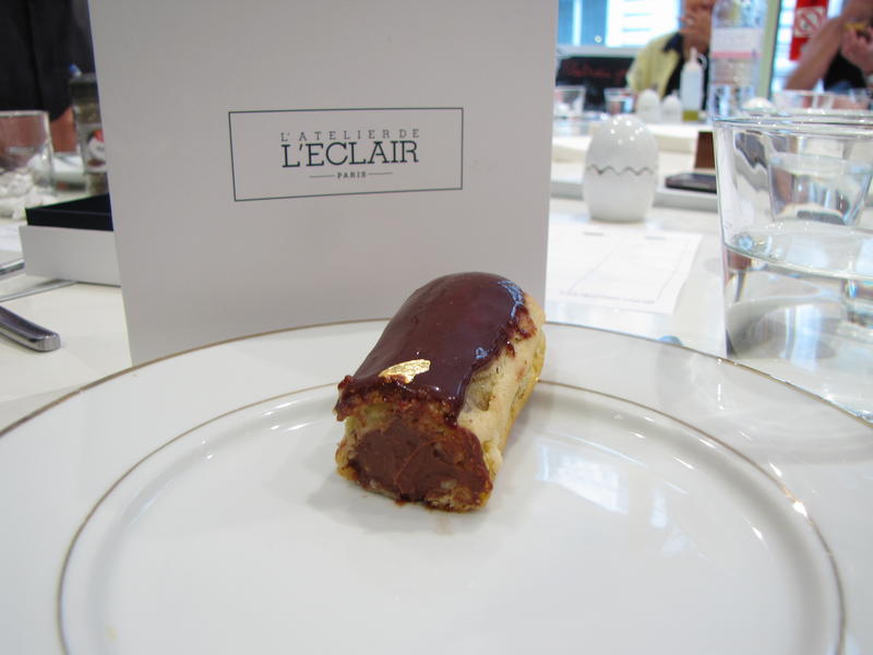 Assis autour d’une grande table dans la salle du petit restaurant nous avons Dans un premier temps écouté Loïc Bret nous a raconté son parcours professionnel qui malgré son jeune âge est déjà bien long et divers. Car, après avoir travaillé dans plusieurs grandes maisons, puis être compagnon, il a enseigné à l’école nationale de la pâtisserie de ducasse. Puis il est parti en Asie et en Afrique en tant que consultant. Le voici maintenant à la tête d’une boutique dans le 2e, « Atelier de l’éclair » dans laquelle il décline ses éclairs en versions sucrés et salés. Amateur et amoureux de chocolat, il décline l’éclair en plusieurs versions chocolatées grand cru ! Il nous a expliqué ensuite comment il concevait et créait ses éclairs, les techniques qu’il utilise… Bref, il était passionnant !