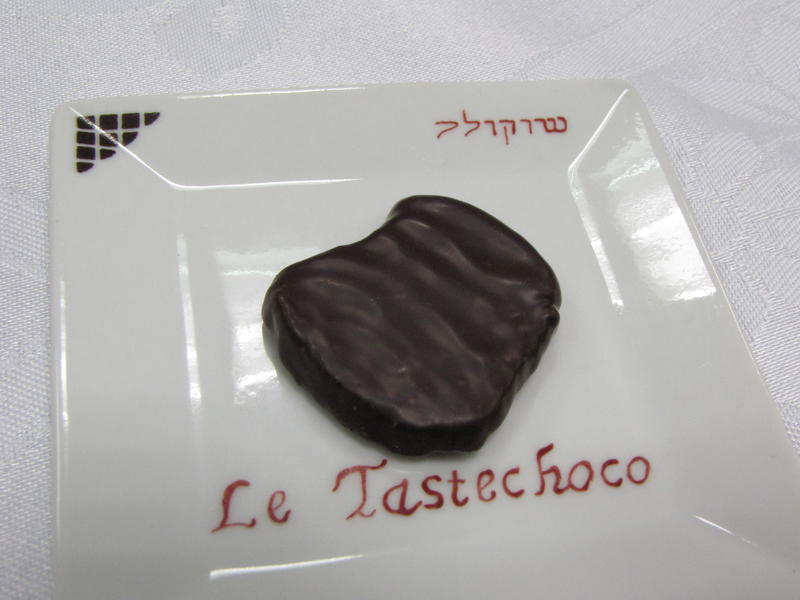 8e bonbon : Beau morceau de gingembre confit enrobé dans son chocolat. Malgré la puissance du gingembre, nous terminons par un beau final de chocolat !