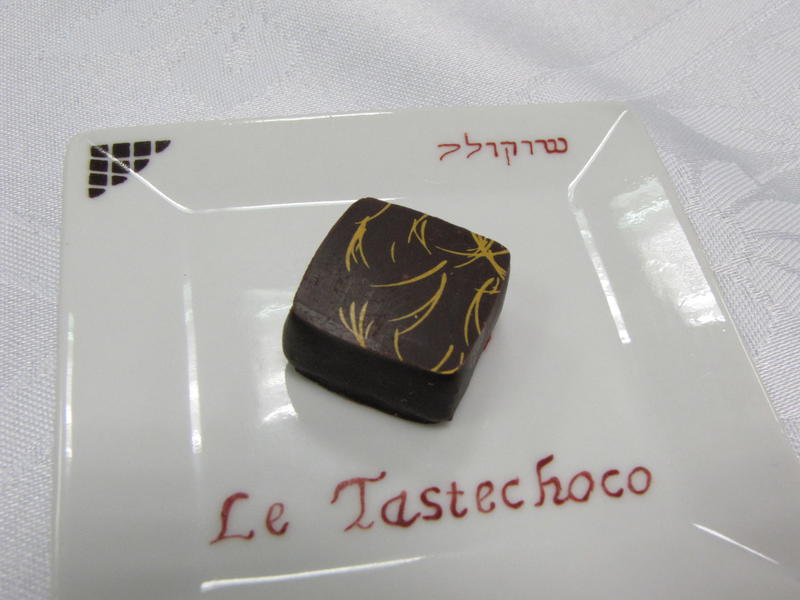 7e bonbon : Ganache noire infusion de gingembre : Sortilège de Franck Kestener. Alchimie des épices et du chocolat Création parsemée de joncs d’or. Bel équilibre.