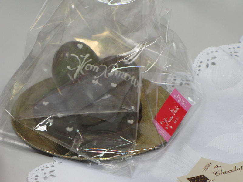 Un biscuit dacquoise au chocolat en forme de cœur, feuilletine-praliné, gelée de framboises, crème au chocolat au lait parfumée à l’orange et au cognac, décors de pétales de roses.