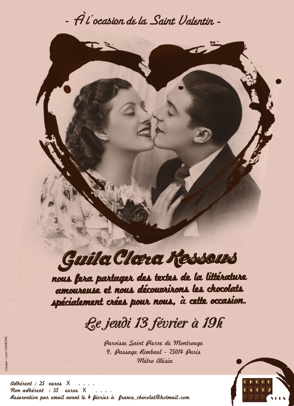 À l’occasion de la Saint-Valentin, Guila Clara KESSOUS nous fera partager des textes de la littérature amoureuse et nous découvrirons les chocolats spécialement crées pour nous, à cette occasion.